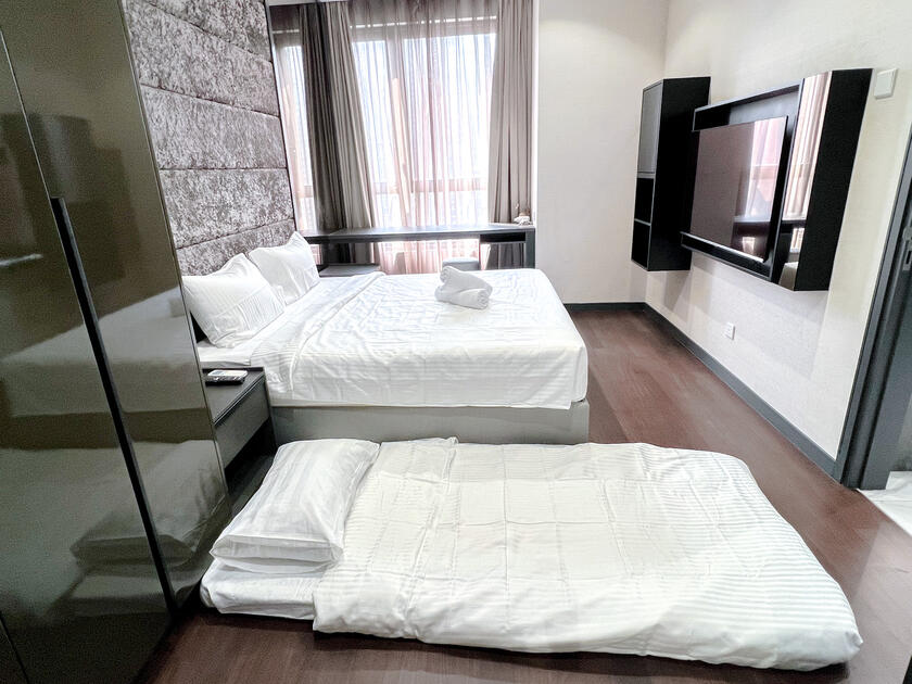 The only unit with KLCC view directly from the living room, has 2 bedrooms, 2 bathrooms, 1-king bed, 1-queen bed & 2 single mattresses that fits up to 6 guests for your vacation, gathering or special occasion.